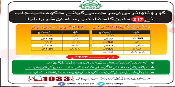 کورونا وائرس کا علاج کرنے والے ڈاکٹروں اور پیرا میڈیکس کے لیے حکومت پنجاب نے پونے 22 کروڑ ۔روپے کا حفاظتی سامان خرید لیا