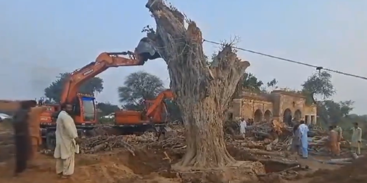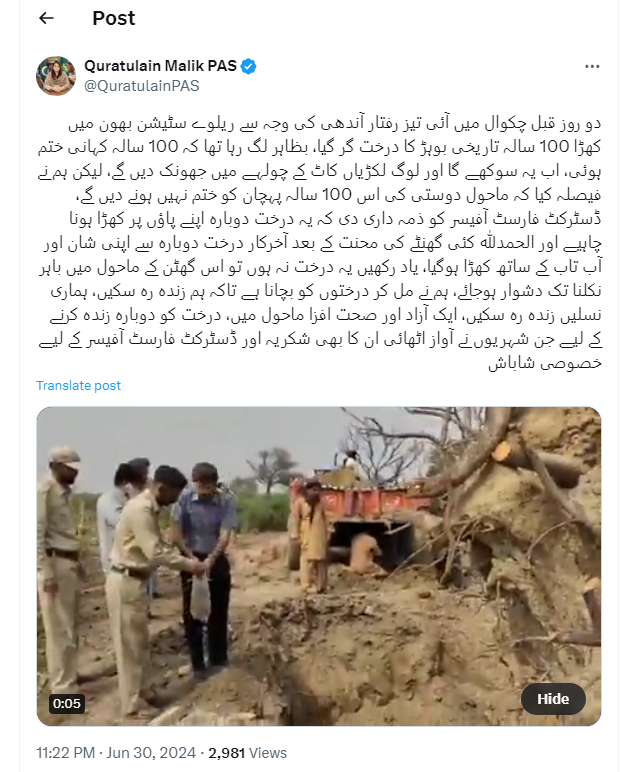 اسلام آباد (نیوز ڈیسک )چکوال انتظامیہ کا قابل ستائش کارنامہ ، تیز آندھی سے زمین بوس ہونے والے 100سال قدیم تاریخی بوہڑ کے درخت کو واپس کھڑا کر دیا ۔ تفصیلات کے مطابق دو روز قبل چکوال میں آئی تیز رفتار آندھی کی وجہ سے ریلوے سٹیشن بھون میں کھڑا 100 سالہ تاریخی بوہڑ کا درخت گر گیا تھا ۔ بظاہر لگ رہا تھا کہ 100 سالہ کہانی ختم ہوئی، اب یہ سوکھے گا اور لوگ لکڑیاں کاٹ کے چولہے میں جھونک دیں گے، تاہم چکوال انتظامیہ ( ڈپٹی کمشنر چکوال قراۃ العین ملک) نے فیصلہ کیا کہ ماحول دوستی کی اس 100 سالہ پہچان کو ختم نہیں ہونے دیں گی۔ ڈسٹرکٹ فارسٹ آفیسر کو ذمہ داری سونپی گئی کہ یہ درخت دوبارہ اپنے پاؤں پر کھڑا ہونا چاہیے جس کے بعد کئی گھنٹے کی محنت کے بعد آخرکار درخت دوبارہ سے اپنی شان اور آب و تاب کے ساتھ کھڑا ہوگیا۔ اس حوالے سے ڈپٹی کمشنر چکوال قراۃ العین ملک نے سوشل میڈیاپلیٹ فارم ایکس پر اپنی ٹوئٹ میں پیغام دیا کہ’’ یاد رکھیں یہ درخت نہ ہوں تو اس گھٹن کے ماحول میں باہر نکلنا تک دشوار ہوجائے، ہم نے مل کر درختوں کو بچانا ہے تاکہ ہم زندہ رہ سکیں، ہماری نسلیں زندہ رہ سکیں، ایک آزاد اور صحت افزا ماحول میں، درخت کو دوبارہ زندہ کرنے کے لیے جن شہریوں نے آواز اٹھائی ان کا بھی شکریہ اور ڈسٹرکٹ فارسٹ آفیسر کے لیے خصوصی شاباش‘‘۔