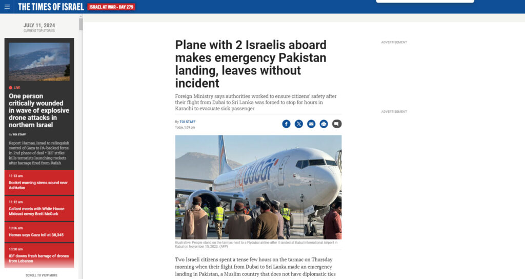 کراچی ایئرپورٹ پر غیر ملکی طیارے کی لینڈنگ کے بعد ڈاکٹرز کی ٹیم نے سری لنکن خاتون کا معائنہ کیا تو اس وقت تک وہ انتقال کر چکی تھیں، ڈاکٹرز کے مطانق مسافر خاتون دوران پرواز ہی حرکت قلب بند ہونے کے باعث انتقال کرگئیں۔ایئرپورٹ پر تعینات وفاقی ہیلتھ افسر نے خاتون مسافر کا ڈیتھ سرٹیفکیٹ جاری کیا، جس کے بعد غیر ملکی ایئرلائن خاتون مسافر کی میت کو لے کر کراچی ایئرپورٹ سے کولمبو روانہ ہوگئی تاہم اب اس پرواز کے حوالے سے نئے چونکا دینے والے انکشافات سامنے آئے ہیں ۔ اسرائیل کے معروف اخبار’’ دی ٹائمز آف اسرائیل ‘‘ کے ویب پورٹل کی ایک رپورٹ میں دعویٰ کیا گیا ہے کہ جمعرات کی صبح کراچی میں ایمر جنسی لینڈنگ کرنے والی فلائٹ میں 2اسرائیلی شہری موجود تھے جو لینڈنگ سے اڑان بھرنے تک سخت تنائو کے عالم میں رہے ۔ رپورٹ کے مطابق اسرائیلی شہری پاکستان میں لینڈنگ کرنے کے ساتھ ہی اسرائیلی وزارت خارجہ سے رابطے میں تھے تاہم کچھ گھنٹوں بعد بغیر کسی ناخوشگوار واقعہ کے طیارے نے اڑان بھر لی ۔ واضح رہے کہ غزہ میں معصوم مسلمانوں پر ظلم و بربریت کے پہاڑ توڑنے کے بعد سے اسرائیلی قومی سلامتی کونسل کی جانب سے اسرائیلی شہریوں کو کسی بھی ناخوشگوار واقعہ سے بچنے کیلئے پاکستان کے سفر سے گریز کی ہدایات جاری کر رکھی ہیں ۔