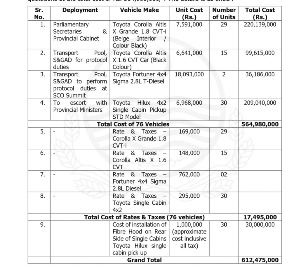 ایس اینڈ جی اے ڈی کے پروٹوکول کیلئے 3 کروڑ 61لاکھ سے دو لگژری گاڑیاں بھی انڈس موٹرز سے خریدی جائیں گی۔ صوبائی وزراء کے پروٹوکول کیلئے 20 کروڑ 90 لاکھ روپے سے 30 لگژری گاڑیاں بھی خریدی جائیں گی اور ایک کروڑ 74 لاکھ 95 ہزار روپے گاڑیوں پر ٹیکس بھی ادا کیا جائے گا، 30 گاڑیوں کی سجاوٹ کیلئے 3 کروڑ مزید خرچ کیے جائیں گے۔