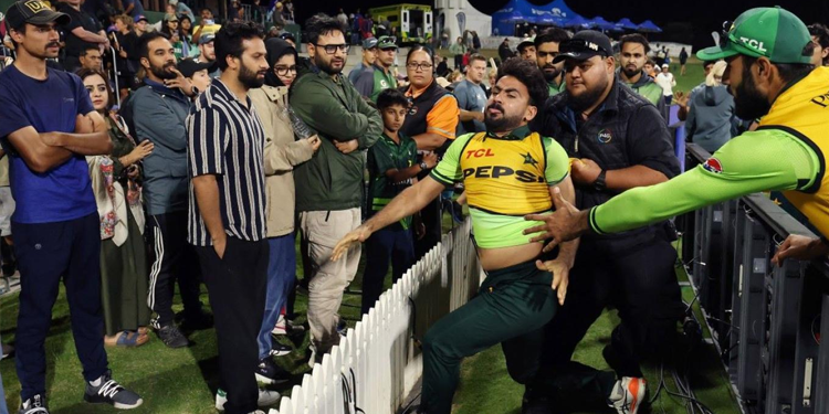 پاکستان اور نیوزی لینڈ کے درمیان کھیلے گئے تیسرے ایک روزہ میچ میں قومی کرکٹر خوشدل شاہ پاکستانی ٹیم کو برا بھلا کہنے پر مبینہ افغان تماشائی سے الجھ پڑے۔