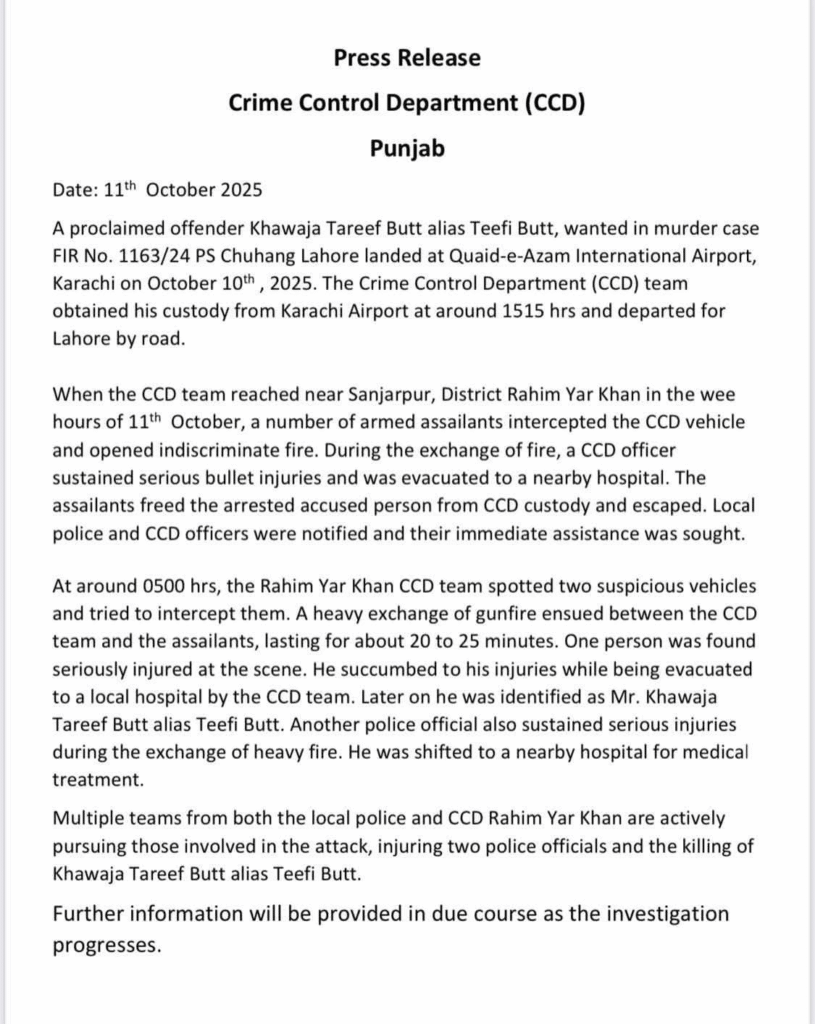 مقامی پولیس اور CCD رحیم یار خان کی متعدد ٹیمیں حملے میں ملوث افراد کی گرفتاری کے لیے سرگرم عمل ہیں۔
