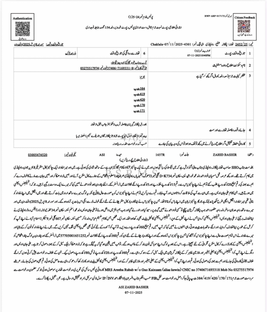 مدعیہ مقدمہ ارینہ رباب نے پولیس کو بتایا کہ ان کی شادی چائینیز نیشنل گاؤ کیزان سے ہوئی ہے اور میں اور میرا خاوند ایک چائینیز کال سینٹر بحریہ ٹاؤن فیز 8 میں کام کرتے تھے انہوں نے بتایا کچھ عرصہ قبل چند نامعلوم افراد ہمراہ ہمارے کال سینٹر پر آئے اور ہمیں بلیک میل کر 20 لاکھ روپے بھتہ وصول کیا۔ پھر انہوں نے دوبارہ ریڈ کیا اور کہا کہ وہ ہمارے ملاقات اپنے باس جوکہ پاکستان آرمی میں بریگیڈئیر ہیں اور خفیہ ایجنسی کے ہیڈ بھی ہیں سے کروائیں گے جس کے بعد ہمیں کوئی بلیک میل نہیں کرے گا ۔