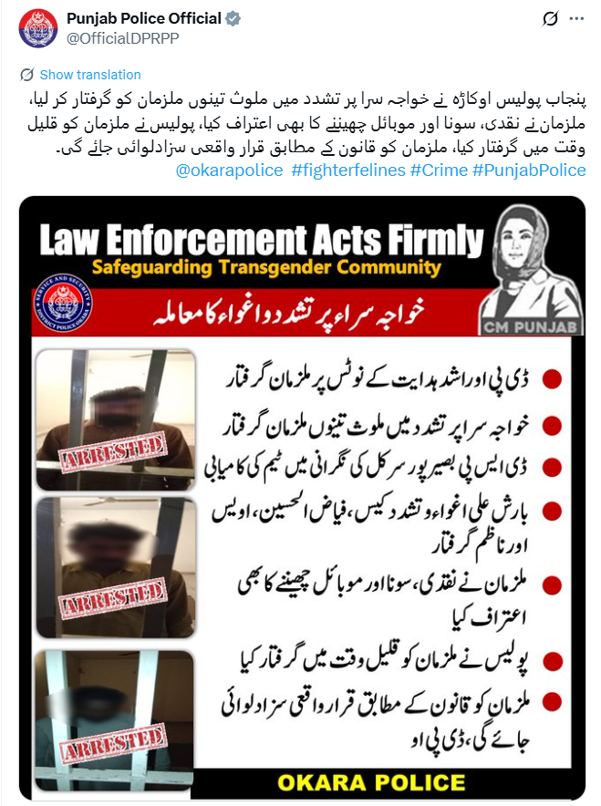 دوسری جانب پنجاب پولیس اوکاڑہ نے خواجہ سرا پر تشدد میں ملوث تینوں ملزمان کو گرفتار کر لیا، ملزمان نے نقدی، سونا اور موبائل چھیننے کا بھی اعتراف کیا ہے ۔ پولیس کا کہنا ہے کہ ملزمان کو قانون کے مطابق قرار واقعی سزادلوائی جائے گی۔