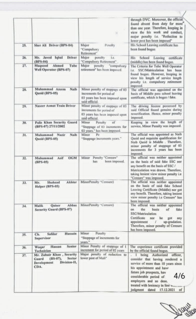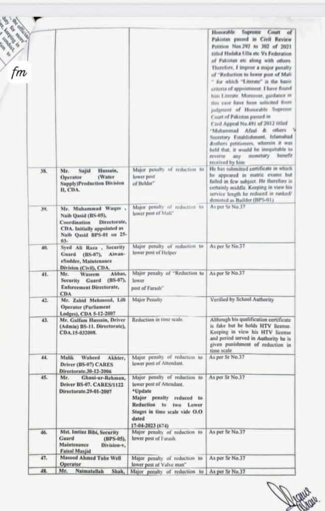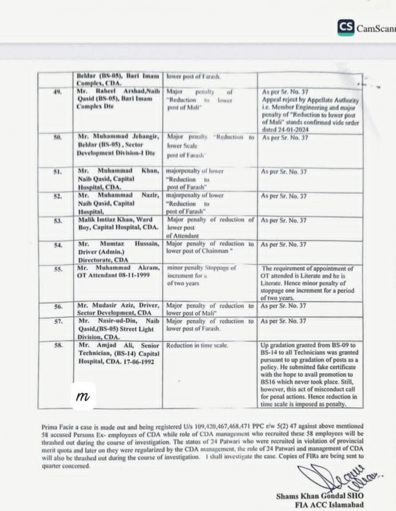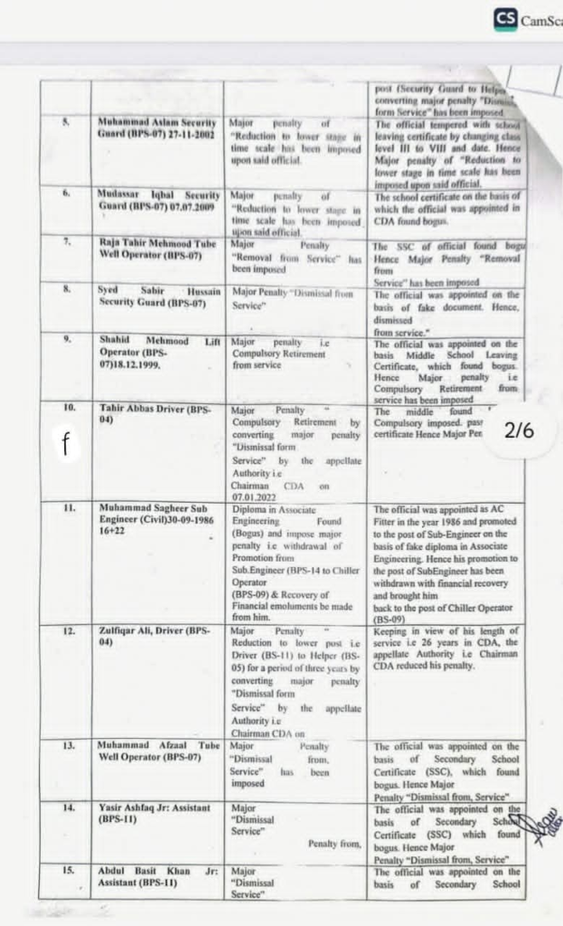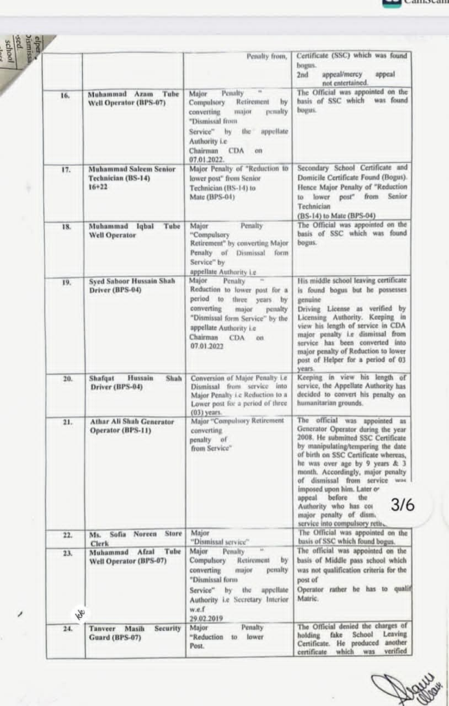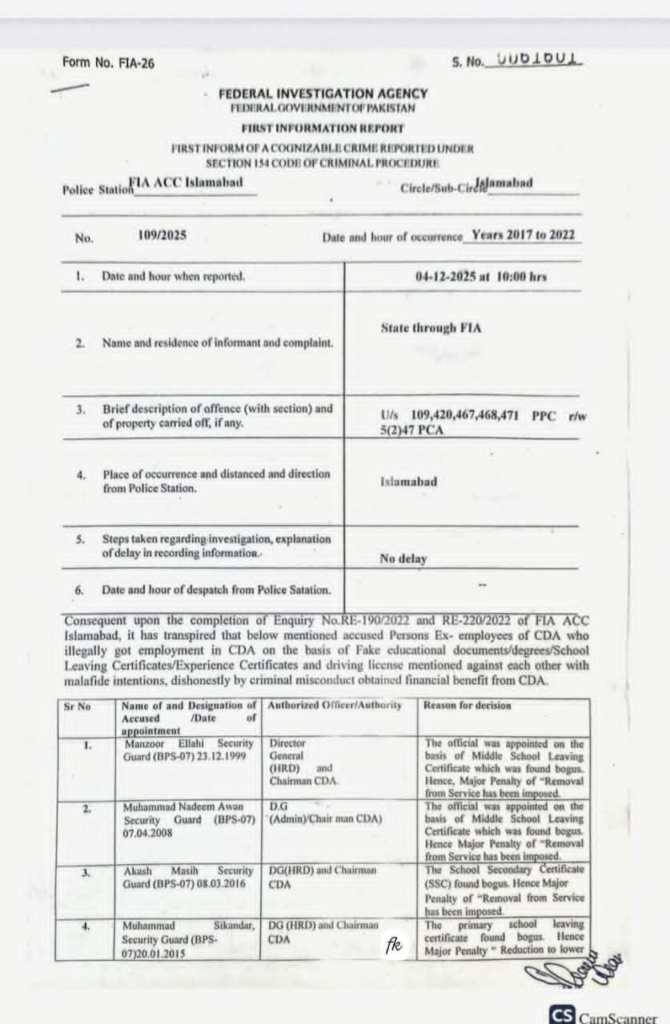 وفاقی دارلحکومت کے سب سے بڑے ادارے سی ڈی اے میں گریڈ ایک سے لے کر 14 تک 58 ملازمین جعلی اسناد جعلی سرٹیفکیٹس اور ڈرائیونگ لائسنس پر بھرتی ہو گئے۔ سب انجینئر،کلرک ،وارڈ بوائے، لیب ٹیکنیشن، سیکیورٹی گارڈ، ڈرائیور اور دیگر آسامیوں پر فیک دستاویزات پر سی ڈی اے میں بھرتی ہوئے تھے۔ ایف آئی اے نے انکوائری مکمل کر کے ایف آئی آر درج کر لی ہے اور تحقیقات کا آغاز کر دیا ہے۔ اس کے علاوہ سی ڈی اے میں صوبائی کوٹے کی خلاف ورزی کرتے ہوئے سی ڈی اے میں 23 پٹواری بھرتی کرنے اور ان کو ریگولر کرنے پر سی ڈی اے منجمنٹ اور ان پٹواریوں کے خلاف میں ایف آئی اے نے تفتیش شروع کر دی ہے۔